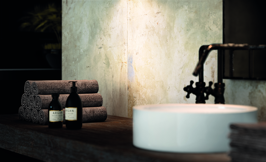 The cement effect meets the signs of a “creative aged effect” expressed by the changes in the shades of colour and by the free and almost “painted” decoration: stratifications of material and new colours that exude design, art and craftsmanship.