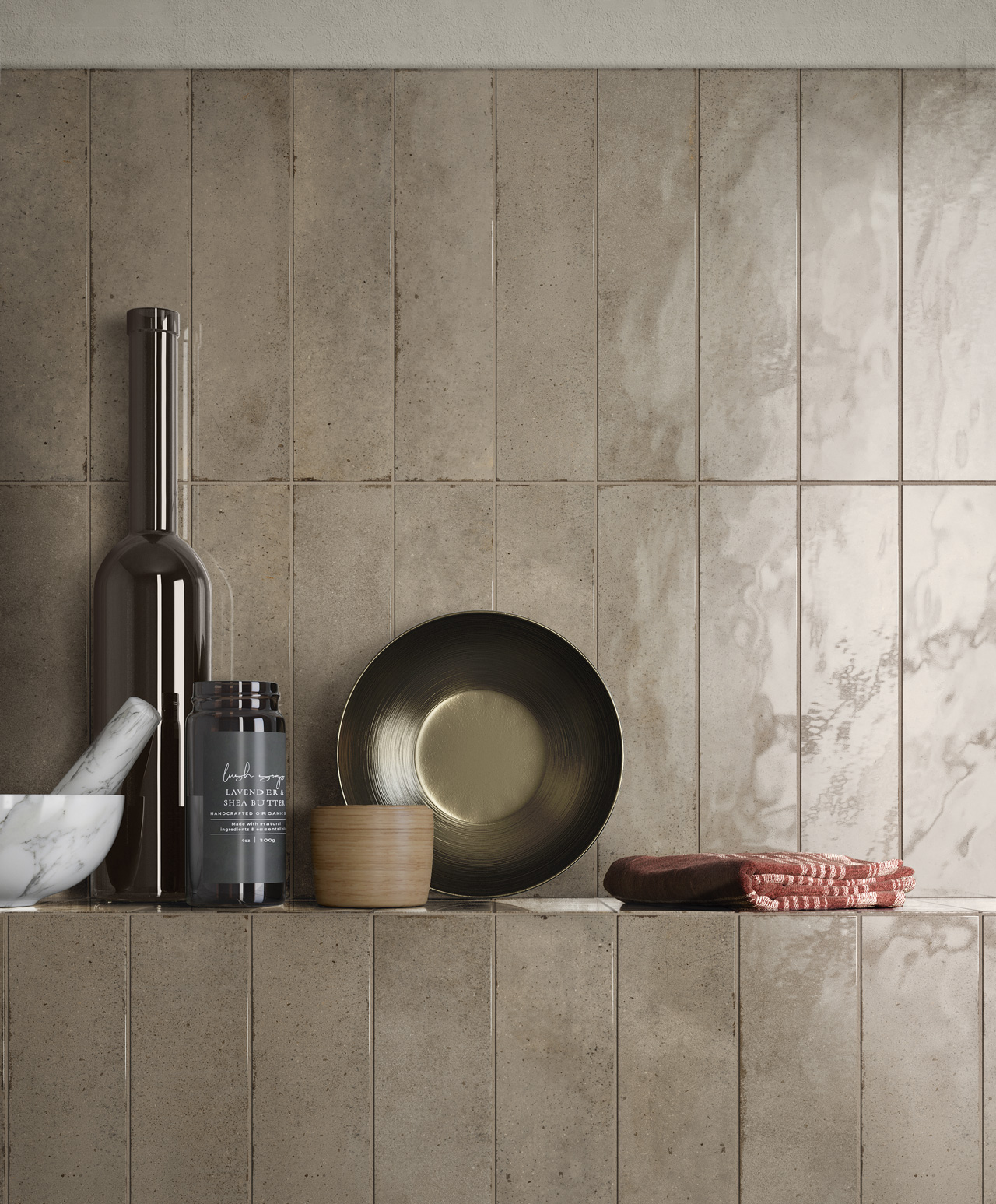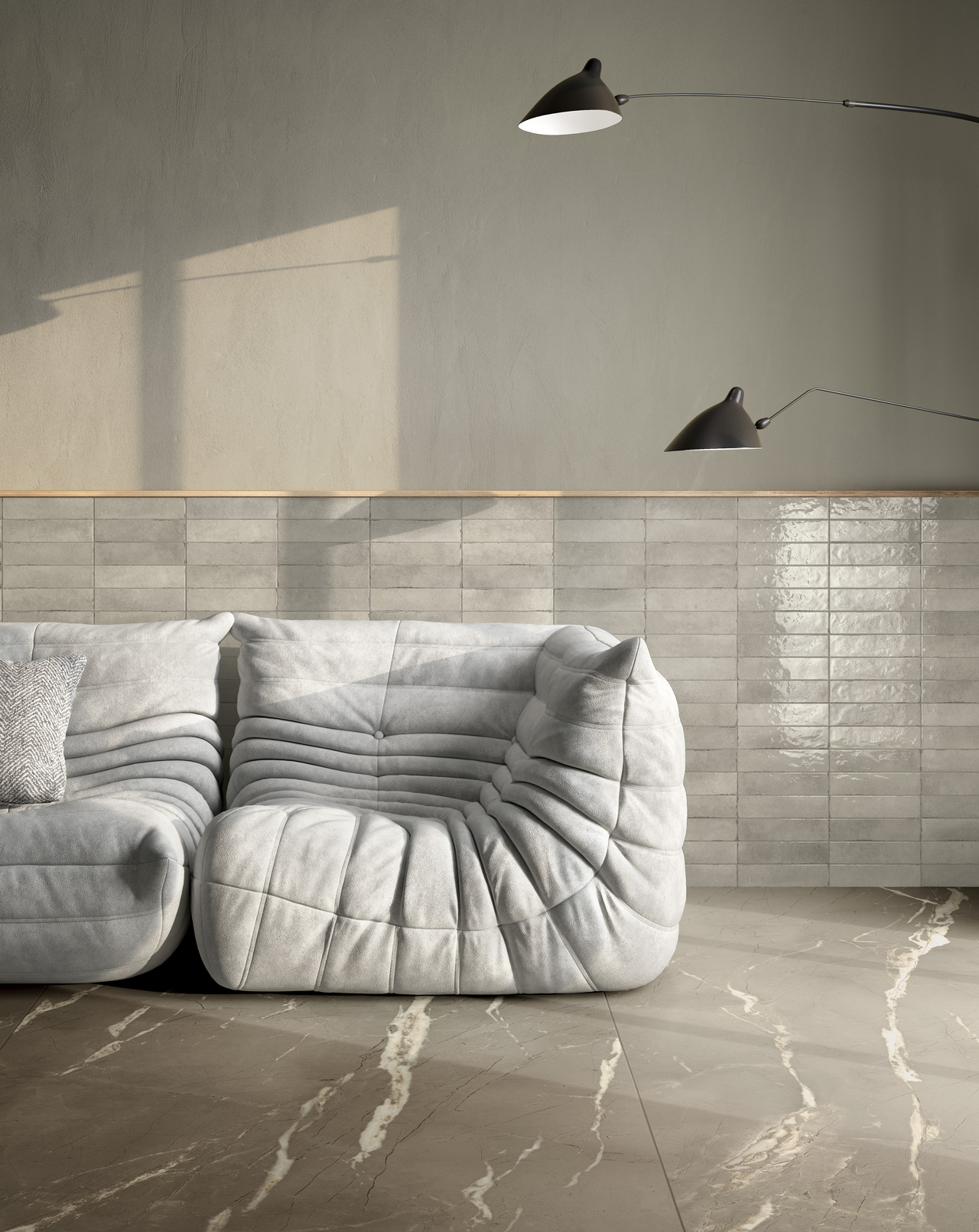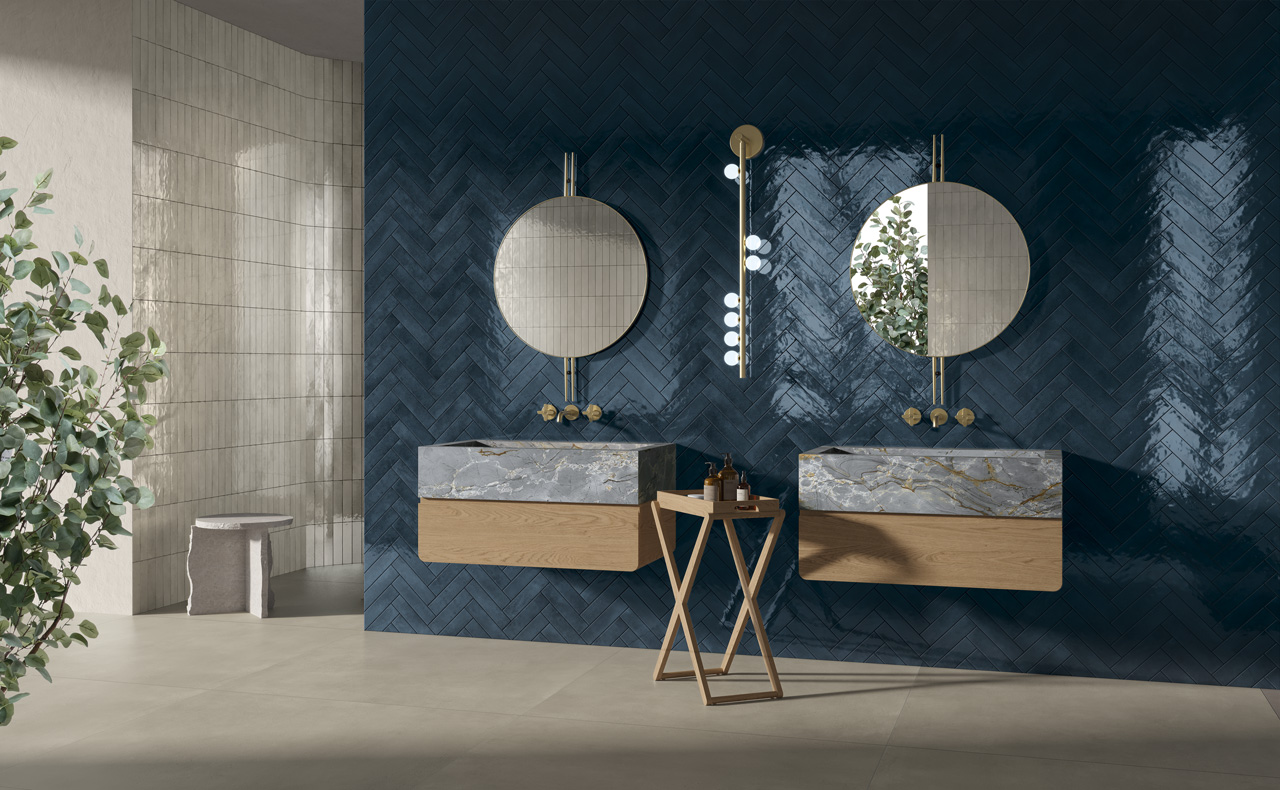 Small size (6×24.6 cm) ceramic tiles with a slightly uneven Shiny surface, that capture light’s every refraction on a colour palette in the hues of the Mediterranean Sea. Shapes and textures create a dynamic visual pattern, in which waves generate ever-changing scenarios, just as the light striking the walls constantly evokes new atmospheres. A homage to the Italian ceramic tradition that bestows a new, exquisite, vibrant tactile beauty on interiors, for combination with a variety of surfaces in elegant cross-over design schemes.