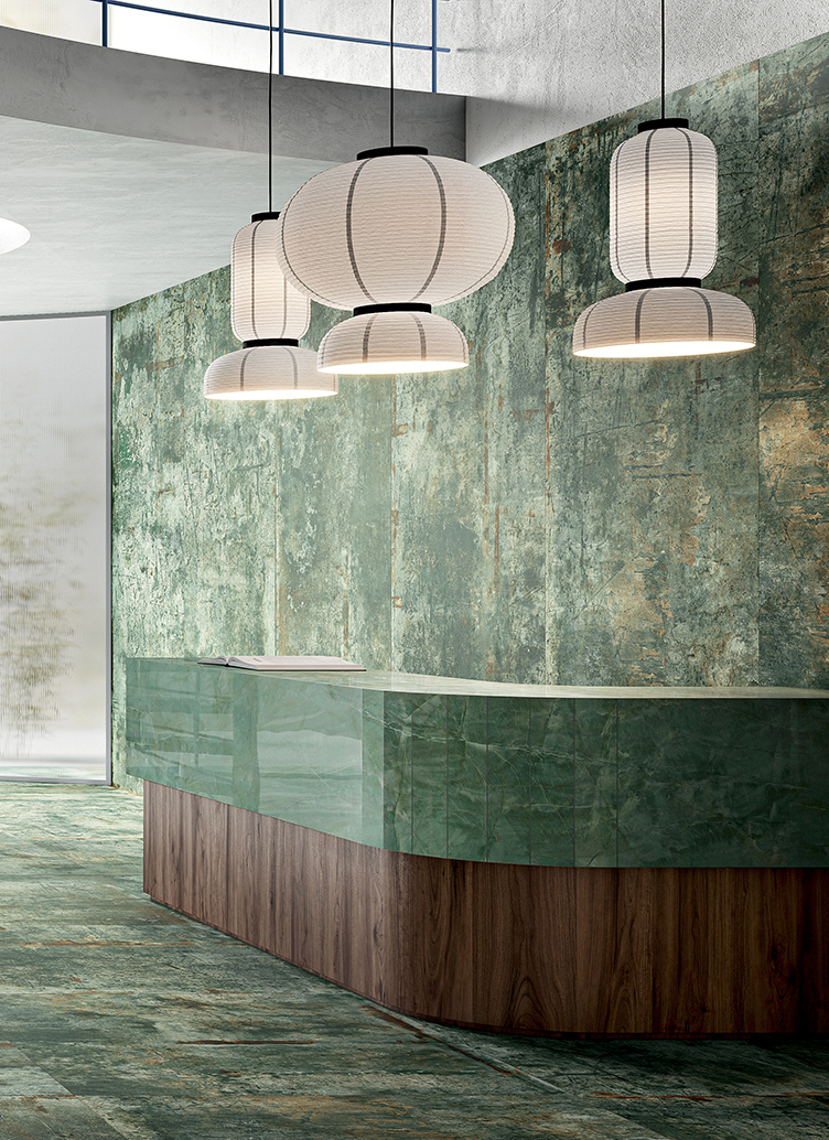 The Crystal technology enriches surfaces with a special shine and transparency, generated by a precious mix of tiny particles of crystals and pearly pigments, refracting the light in an infinity of constantly changing ways. The patterning textures acquire vastly greater brightness and depth. This technology gives surfaces iridescence that changes with the light, generating