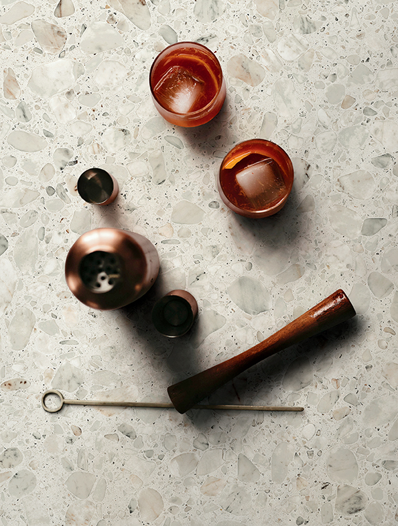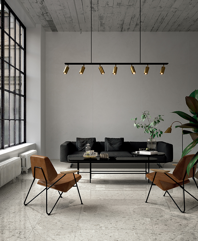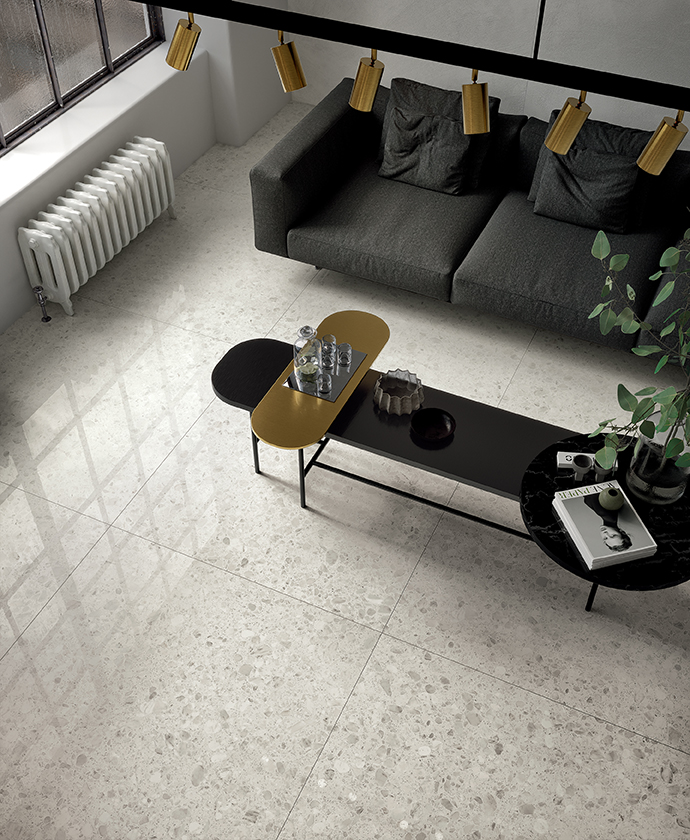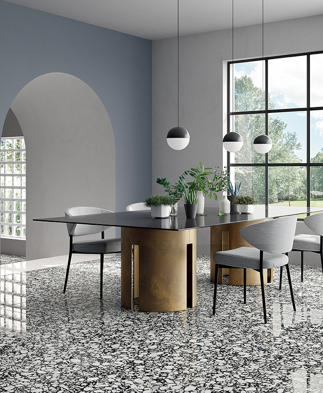 Inspired by Venetian terrazzo tiling: where fragments of stones, earthenware, and marble, mixed with cement and lime form a unique compound with an uneven appearance and variable textures.